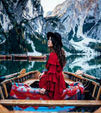 «Девушка в красном платье на горном озере»